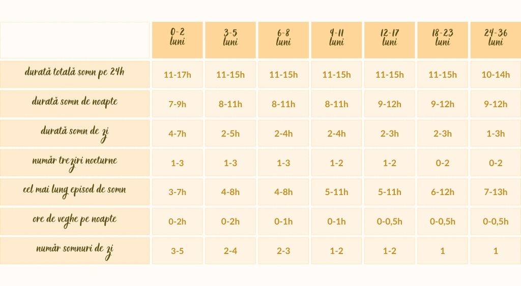 0-3 luni: bebelușii au un ritm de somn fragmentat și nu pot distinge între zi și noapte; ei dorm în mod asemănător pe parcursul întregii zile și nopți, cu perioade scurte de veghe pentru hrănire și schimbarea scutecului.