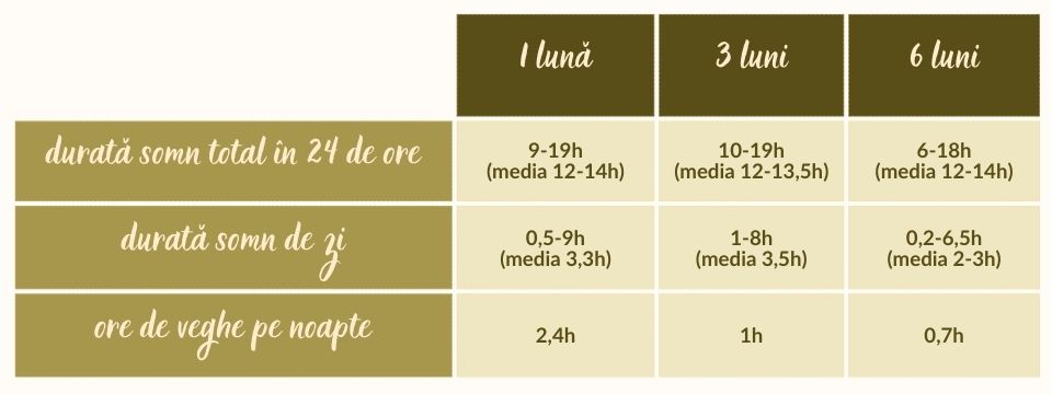 3-6 luni: această perioadă coincide cu debutul secreției proprie de melatonină și mulți încep să doarmă mai mult pe timp de noapte și să aibă perioade mai lungi de veghe în timpul zilei; totuși, încă pot exista treziri frecvente pentru hrănire, schimbare de scutec sau pentru disconfort.